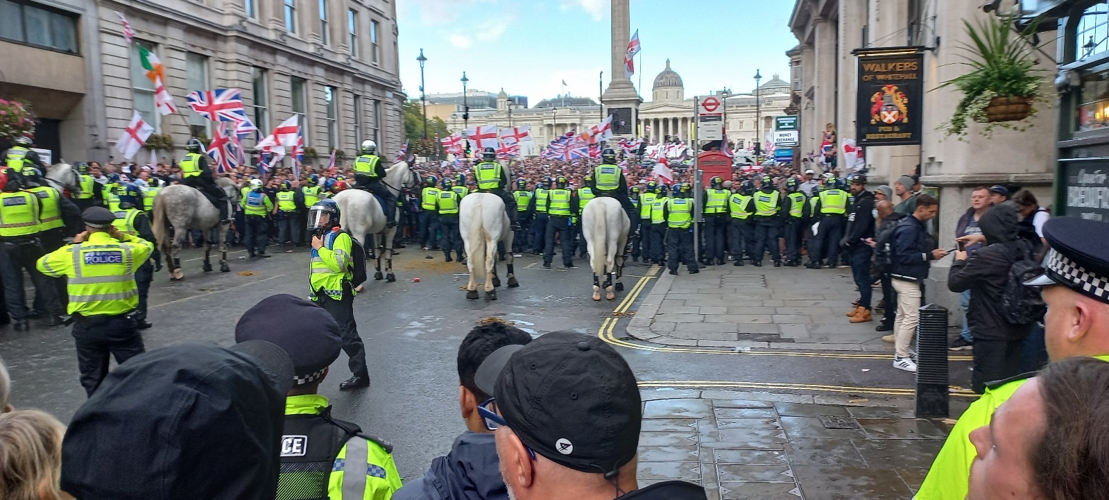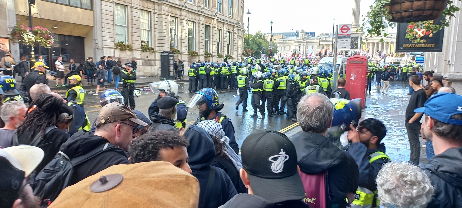 As the march approached Charing Cross Station, a small group of Tommy Robinson supporters began jeering at demonstrators. Tensions escalated further as the counter protest moved past Trafalgar Square, and far right supporters advanced along a parallel street towards Whitehall.