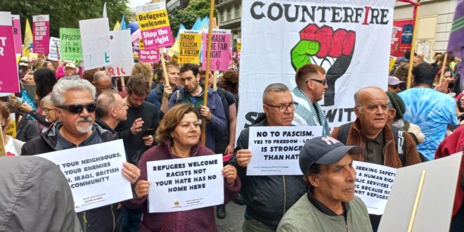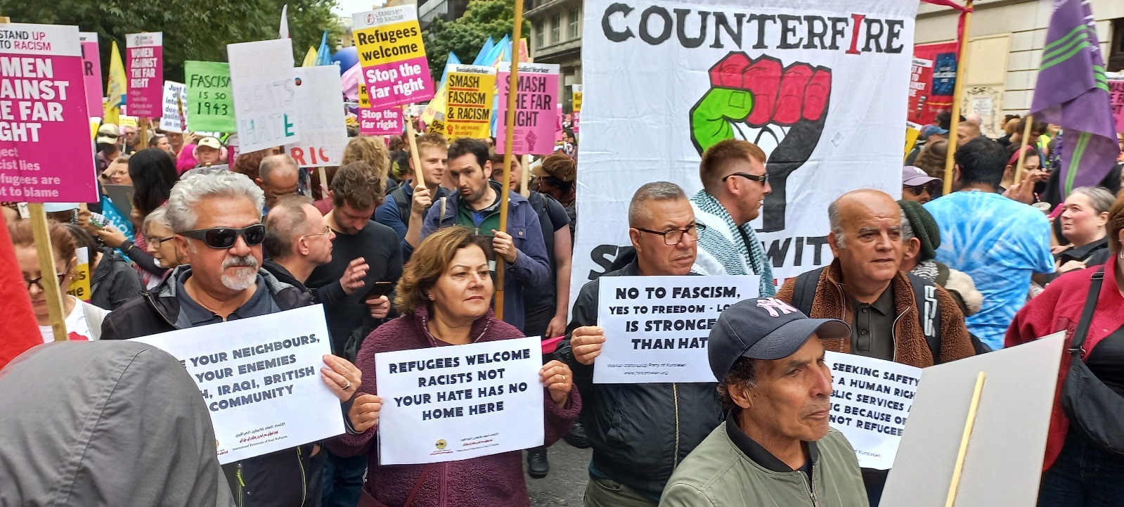 On 13 September, comrades from the International Federation of Iraqi Refugees (IFIR) joined the Stand Up To Racism (SUTR) counter demonstration in London. The mobilisation was in response to the far right “Unite the Kingdom” march, led by Tommy Robinson. The counter protest assembled at Russell Square from midday, with MP Diane Abbott leading a women’s section at the front of the march.